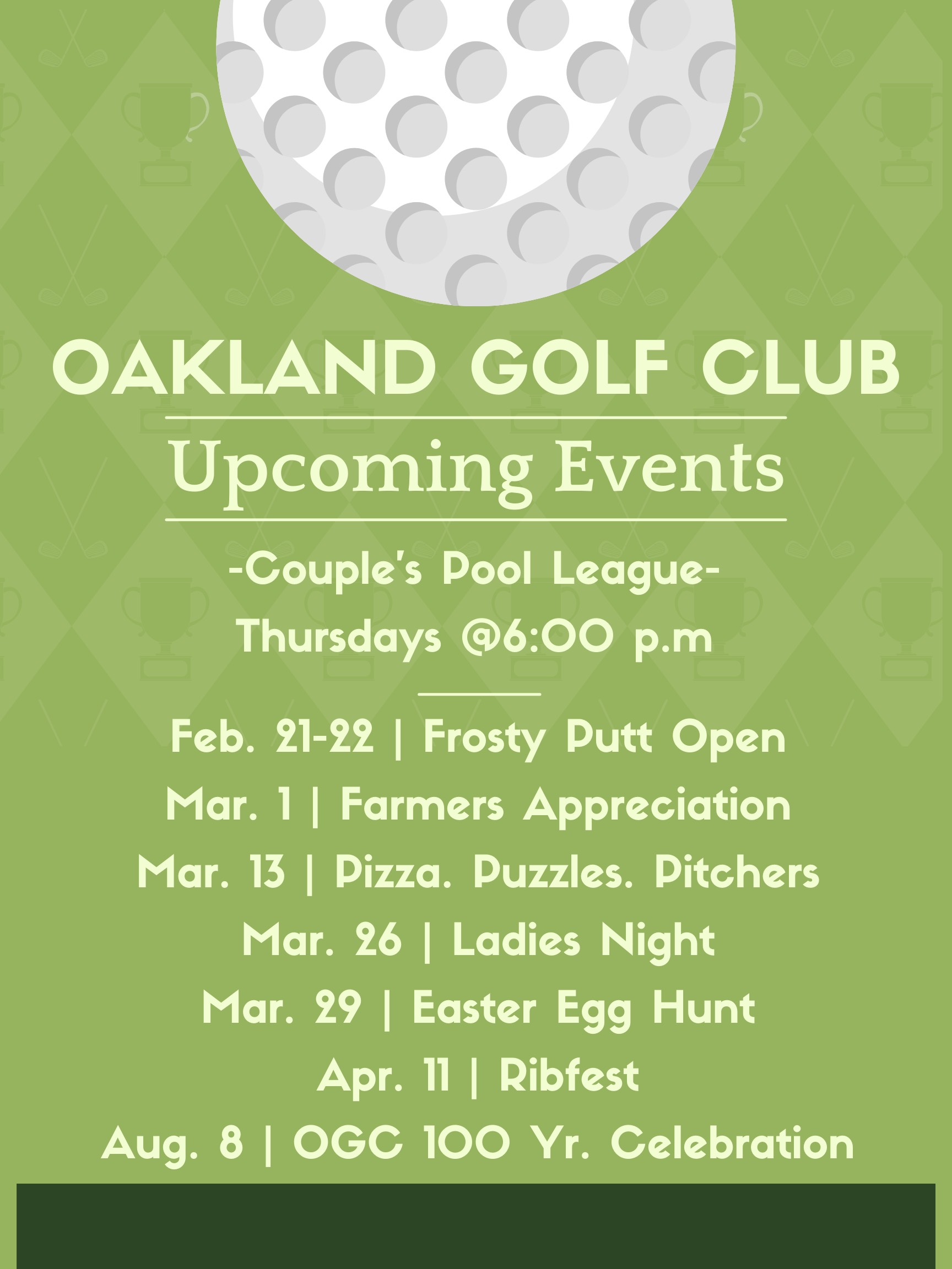 The Oakland Golf Club began as a cow pasture in 1922 and in 1926 the golf course formally opened for play. Over the years it has evolved into a beautiful 18-hole layout. Join us on August 8, 2026 to celebrate our centennial…..100 years of golf in Oakland!